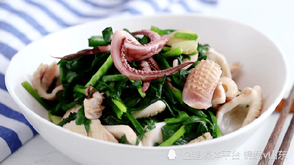 1、首先把鱿鱼须和鱿鱼板上的外皮撕下来,接着去掉内脏冲洗干净后再切成条,然入沸水中焯水,大约焯水3分钟,捞出备用。