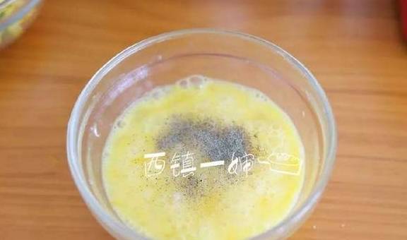 5、两个鸡蛋打散拌匀,倒入少许的盐和黑胡椒粉调味拌匀。
