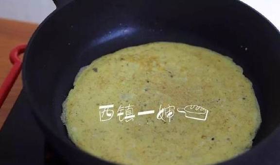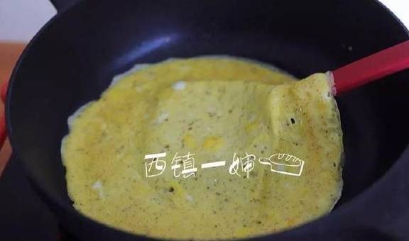 7、等到蛋液凝固不散开后,将鸡蛋饼翻面。