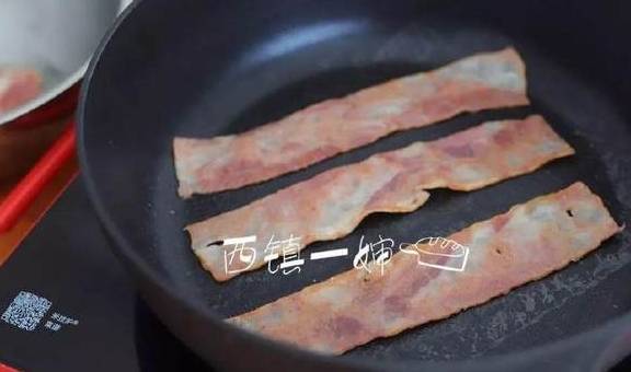 2、将培根平铺放入锅内,然后用小火慢慢煎熟。因为培根本身的油脂蛮高的,所以不用放油,用它自己的油脂即可。
