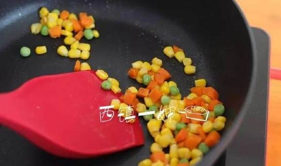 材料:鸡蛋两个(带皮约50克一个),胡萝卜丁玉米丁豌豆粒一小碗,培根五片,食盐1/2小勺,黑胡椒粉1/2茶匙,食用油少许