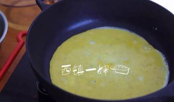 6、锅中倒入少许油,然后倒入鸡蛋液,小火煎到蛋液的一面慢慢凝固。