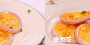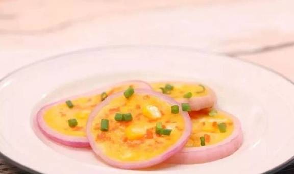 把喜欢的食材和鸡蛋液一起,放入洋葱圈里,烙2分钟就好了。