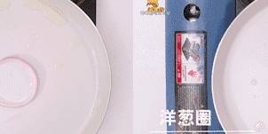 4.锅中倒少许油,放入洋葱圈小火煎10秒;将蛋液舀入洋葱圈,小火煎至蛋液表面凝固