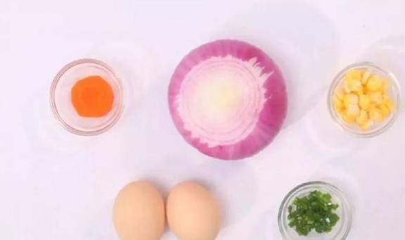 洋葱1个、鸡蛋2个、玉米粒20G、胡萝卜10G、葱花适量、油适量、盐适量