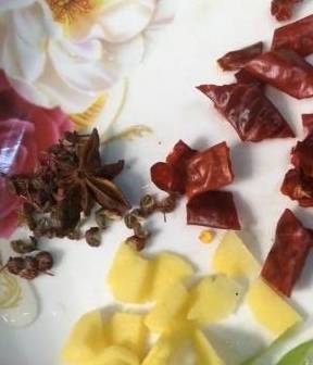 再准备洋葱,切片;干辣椒,切断姜,切小片;再把大葱,切成掉段;再准备一个八角盒些许花椒。加入锅中,炒香。