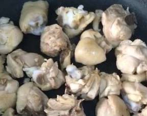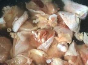 第一步,准备鸡腿,清洗干净,切成小块。锅中加热水,放入鸡腿,再加入适量料酒,烧开,去血沫。