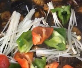 再加入青椒、金针菇,继续炖煮十来分钟,根据自己的口味,加入适量盐,大火收汁,就可以出出锅了。