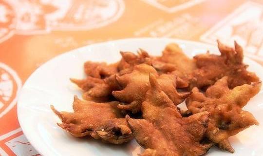 用枫叶做美食选的是绿色叶脉柔软的枫叶,红枫叶是不能吃的。把枫叶收集好后,用盐腌制一年,把叶梗剪掉,用面粉将叶子裹起来放到锅里炸,感觉还挺耗时间的,这得多大耐心啊!