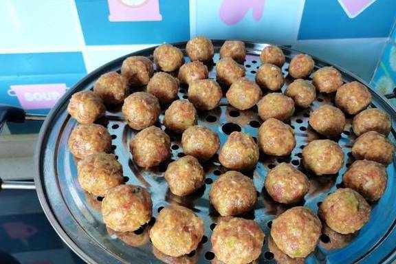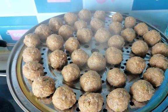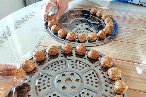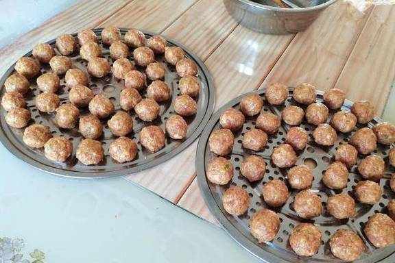 12、两人边聊天边搓丸子,一会儿就做完了,满满两笼屉。