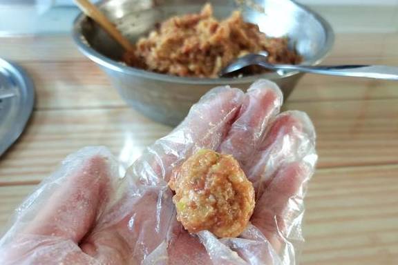 10、戴上一次性手套,给手套上刷一层油,舀一勺馅料,放手里搓圆,丸子就做好了。