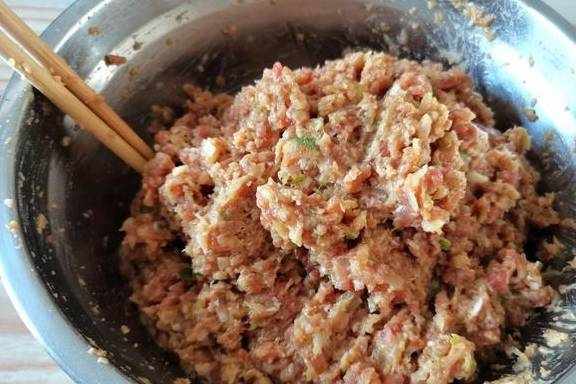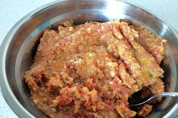 7、剁好的馅料装盆里,锅里热花椒油,100毫升的油里面放一把花椒粒,热油后捞出花椒粒,把花椒油浇到肉馅上,搅拌均匀,这一步很关键,瞬间就能闻到很香的味道。