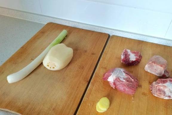 所需食材:猪腿肉四块,姜片两片,莲藕一个,大葱一根。