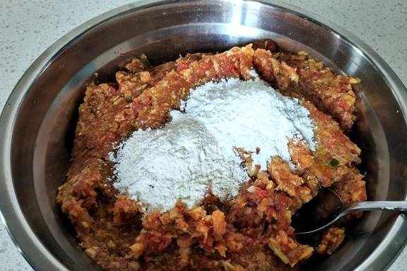 8、再给馅料里面添加一勺淀粉、一勺面粉,再次搅拌均匀,就可以做丸子了。添加了淀粉和面粉,能增加丸子的黏性,加了淀粉,如果用油炸出来,还能使丸子脆皮。