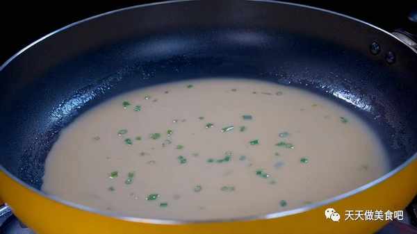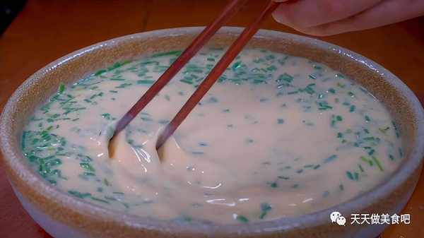 2.葱叶切成葱花,切好后装入碗中,面醒发好后,再倒入三碗清水,水和面粉的比例是4:1,用筷子再次搅拌均匀,使面粉和水充分融合在一起。