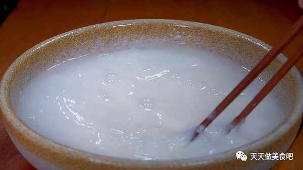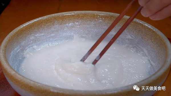 1.盆中加入一小碗面粉,再倒入一小碗清水,用筷子搅拌均匀,搅拌至没有干面粉的状态,再加入一勺食盐,再次搅拌均匀,将食盐搅拌至化开,醒发十分钟。