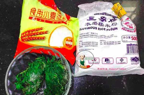 食材:嫩艾草、糯米粉、少许的小麦淀粉、花生芝麻和白糖适量。