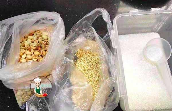 5、准备馅料:花生和芝麻炒熟,放入搅碎机里搅碎(保留一点颗粒的口感)。加入适量的白砂糖拌匀即可。(喜欢吃咸口的也可以做成冬笋咸肉馅的)也可以做成黑芝麻白糖馅料的。