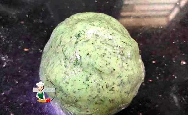 4、倒入搅拌好的艾草泥一起混合拌匀揉成团。先用保鲜膜包裹起来,防止表面风干。