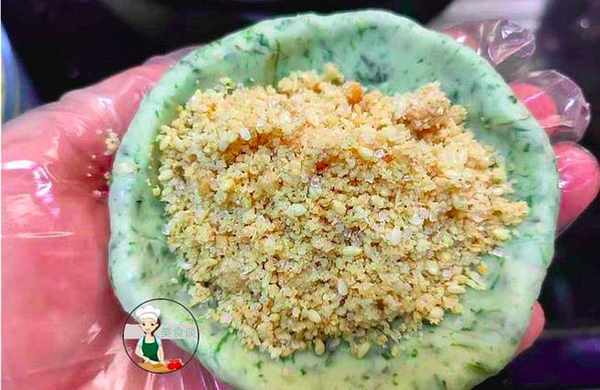 6、取适量的艾草面团压扁,中间包入适量的花生芝麻馅料。