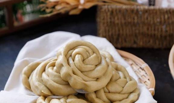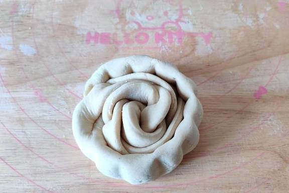 7、继续把面团卷起来,卷好以后就像一朵花一样。