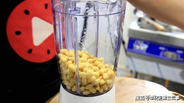 ,用温水泡发5个小时,如果天冷就要多泡一段时间,把泡好的大豆放在搅拌机里面打碎,这个过程要持续五分钟左右。