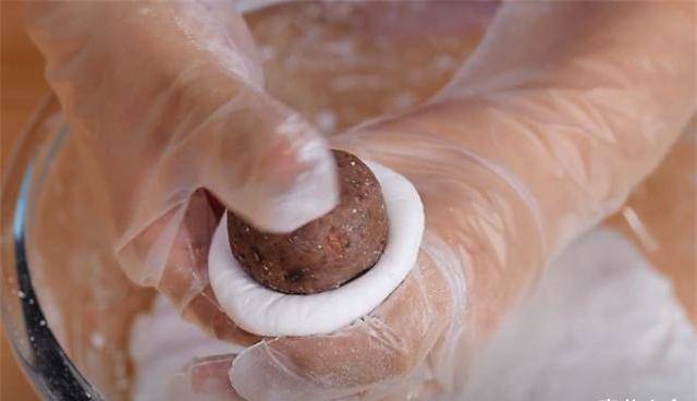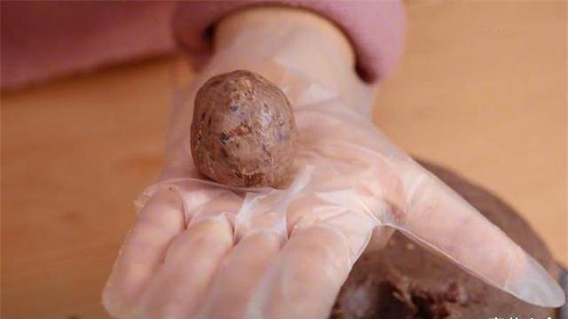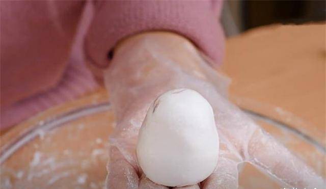 2、这是我自己做的豆沙馅。拉出一个小球,反复接住匀称的状态,形成一个小球。