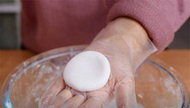 3、这时候我们再处理一下糯米粉面团。同样,我们捏起一小部分面团,抓在手心至湿润,压平。
