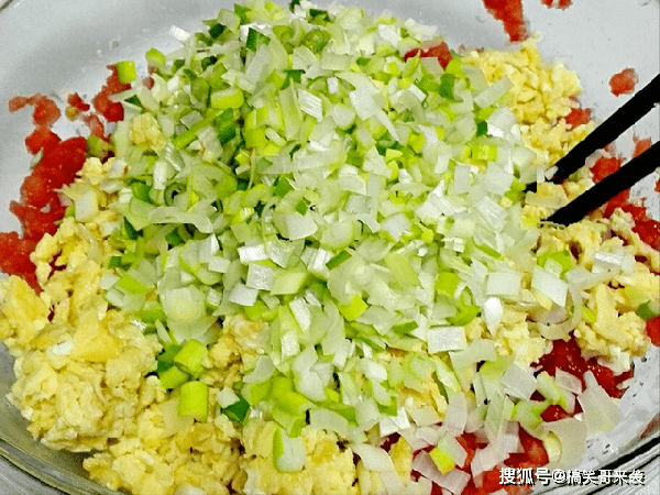 5、把西红柿和鸡蛋混合均匀,再倒入切碎的葱花,加入一勺