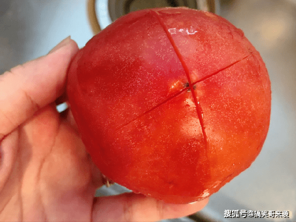 1、准备几个西红柿,第一步要先去掉外皮,用菜刀在顶部切出十字花,切得不要太深,如图所示的样子,长度掌握好。