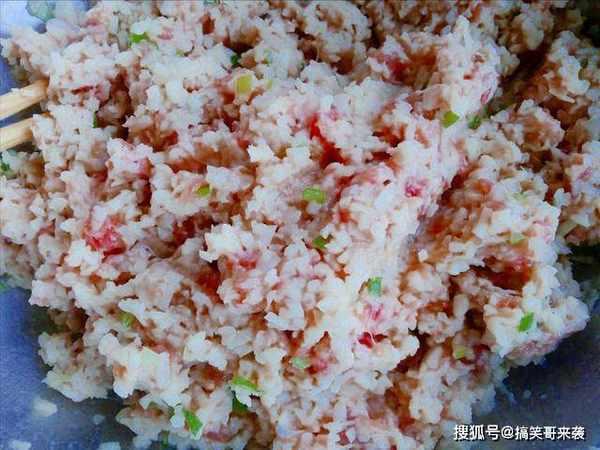 5、剁好之后的萝卜,直接倒在肉馅里面,再次搅拌均匀,馅料部分就制作完成了,只要完成了这一步,就算成功一半了。
