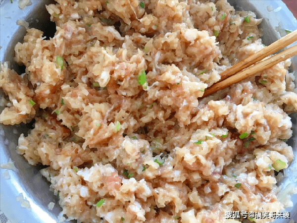 5、用筷子顺时针搅动,等到最后一步,按照个人口味,再放入食盐调味,其他调味品别再放了,就这样就行,馅料部分制作完成。