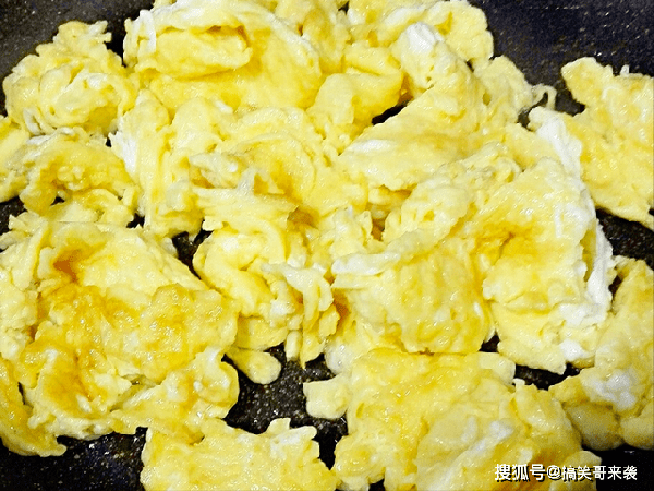 4、把鸡蛋打入碗中,搅拌均匀,起锅烧油,油热倒入鸡蛋液,用中小火煎炒,炒散炒碎,搅成絮状,出锅晾凉备用。