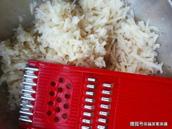 2、白萝卜控干水分以后,用擦丝器斜着擦成细丝,越长越好,舀入一勺食盐,搅拌均匀,腌制十五分钟,等时间到了,装入一块干净的滤布中,攥掉多余的水分。