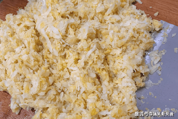 4、把攥干的萝卜丝,放在案板上,用锋利的快刀剁一剁,剁成碎馅。