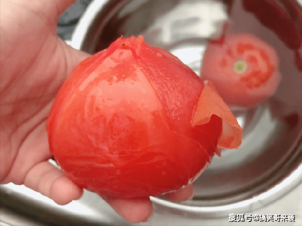 2、把西红柿装入小铁盆中,浇入开水烫一烫,浸泡一分钟左右,拿出西红柿,顺着刀口切开的方向,轻轻地撕掉外皮,