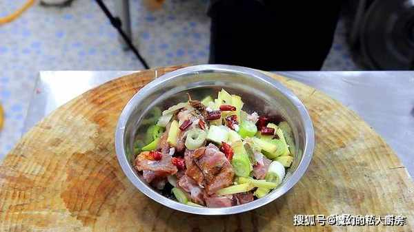 2.大蒜拍扁,生姜切成菱形片,大葱切成马蹄片,都放在排骨的盆里,抓入
