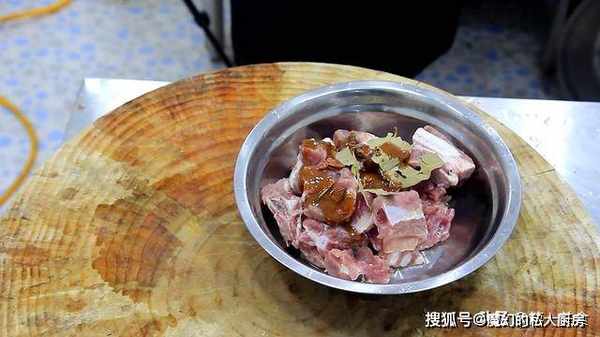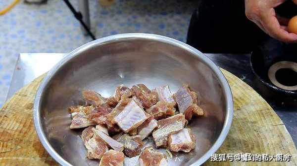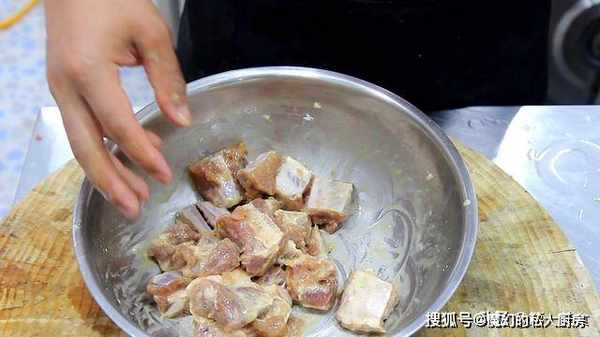 ,剁成小块放在盆中,加入清水,清洗干净以后,用力挤去排骨中的水分,放入