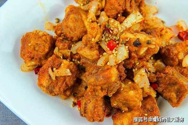 7.起锅,撒上椒盐,在撒椒盐的时候,最好不停的翻锅,然后再撒上辣椒面和孜然粉,翻炒均匀以后,即可出锅装盘,最后撒上熟芝麻。