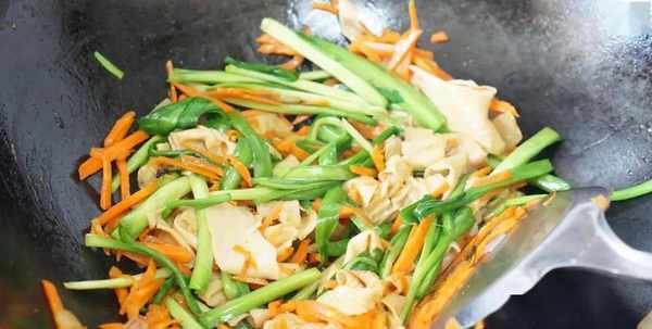 5.接着放入胡萝卜丝和豆皮,1勺蚝油,炒至胡萝卜丝有些缩水的样子。
