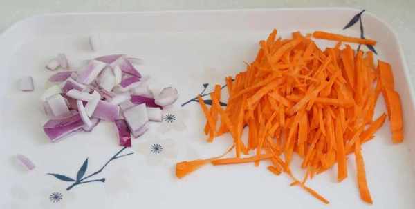 3.胡萝卜切成丝,洋葱切成末备用。这里用洋葱,主要是为了增加葱香味。胡萝卜也是增色增香,丰富营养。