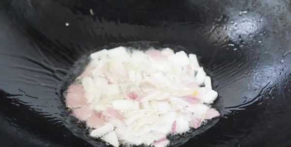 4.锅里放入适量油,放入洋葱炒香。要用小火慢慢炒出葱香味,洋葱表面有些金黄的状态。