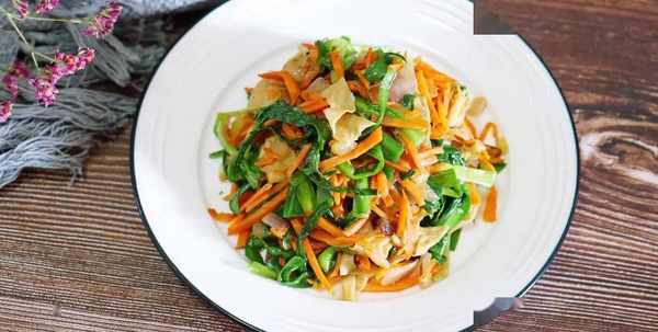 食材:韭菜1把,豆皮1把,胡萝卜半根,洋葱1小块,蚝油1小勺,盐,鸡精适量