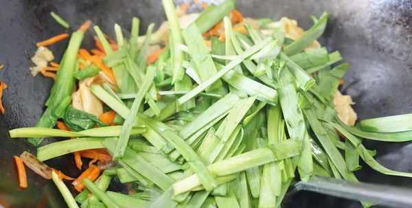 6.放入韭菜段,先把韭菜根部放进入翻炒几下。