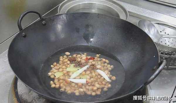 接着把花生米下锅煮一下,放入大葱和生姜片,再抓入