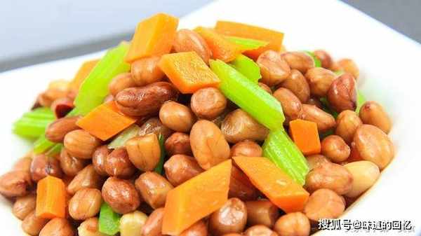 芹菜两根,斜刀切成芹菜段,胡萝卜一段,切成小块,用来和花生米配色。