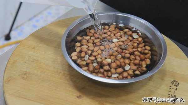 准备一小碗花生米,放在盆中用清水浸泡,花生米喝饱水以后,