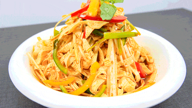 6.把调料化一以后,浇在豆皮、彩椒丝和葱丝上面,搅拌均匀,装盘即可食用。