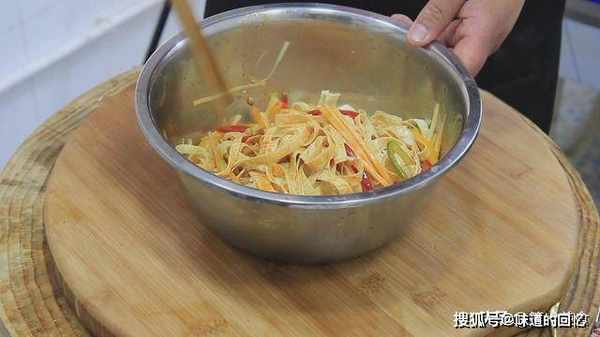 2.泡好以后,叠起来切成豆皮丝,放在盆中清洗干净,然后捞出,放在盆中。