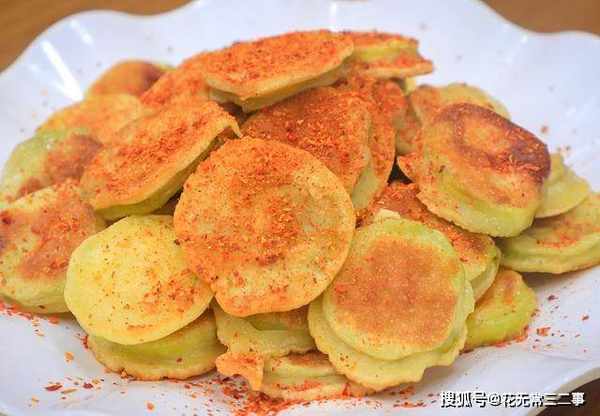 4.保持小火烙5分钟左右,饼两面都呈金黄色时即可出锅,把烙好的小饼摆放在盘中,均匀撒上辣椒面即可。